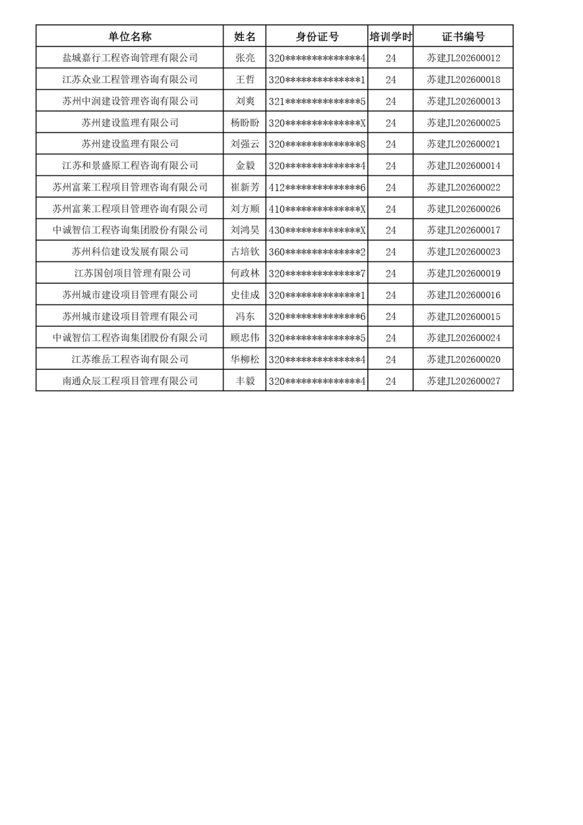 2026年监理人员业务培训完成名单公示(截止到2026年01月20日学习网上发放证书的学员)