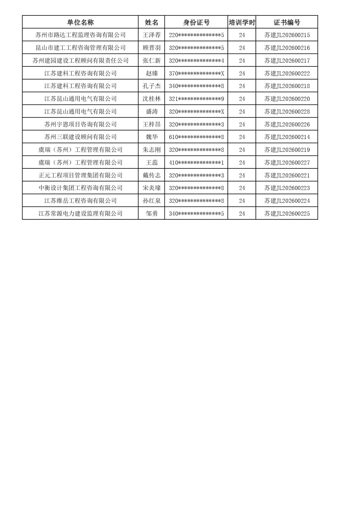 2026年监理人员业务培训完成名单公示(截止到2026年04月14日学习网上发放证书的学员)