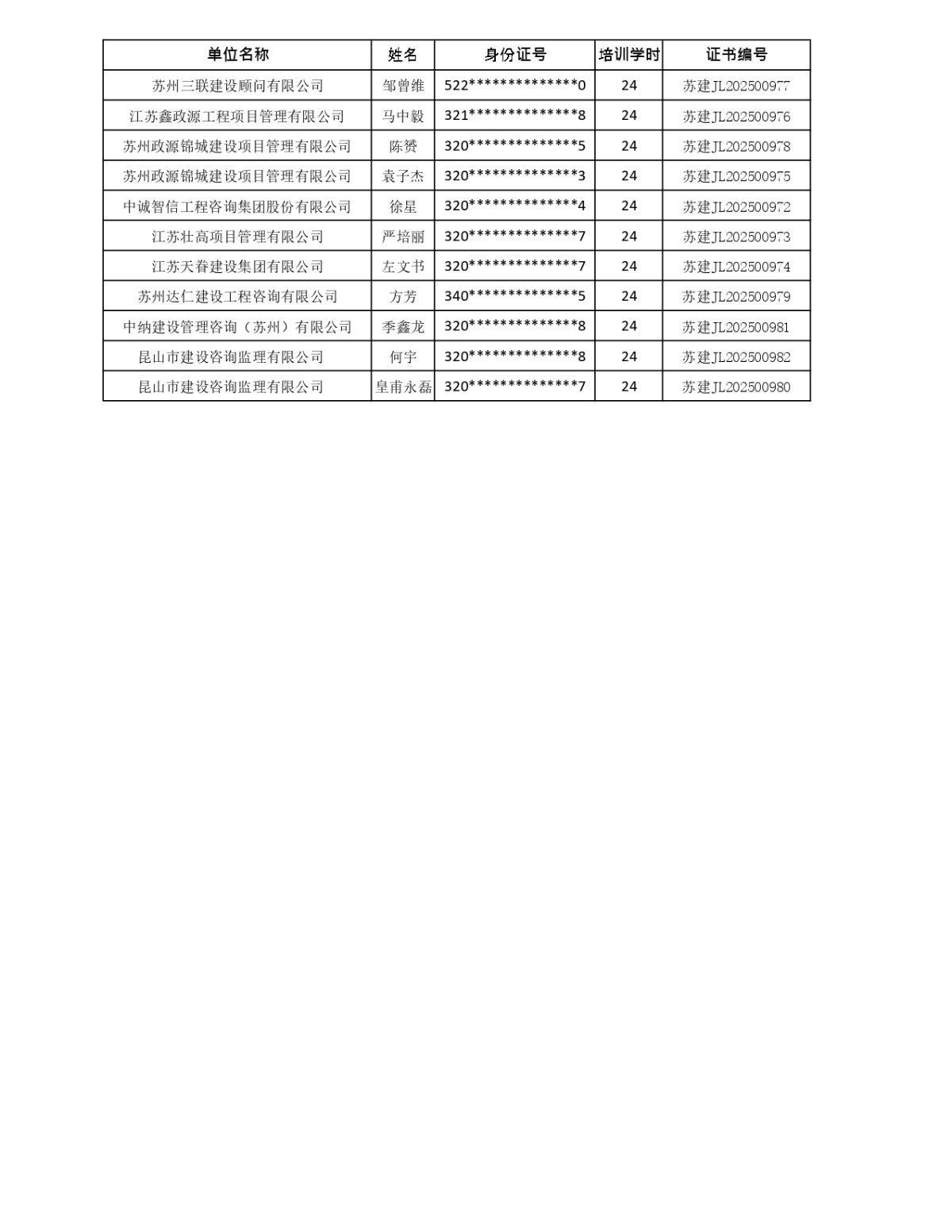 2025年监理人员业务培训完成名单公示(截止到2025年11月18日学习网上发放证书的学员)